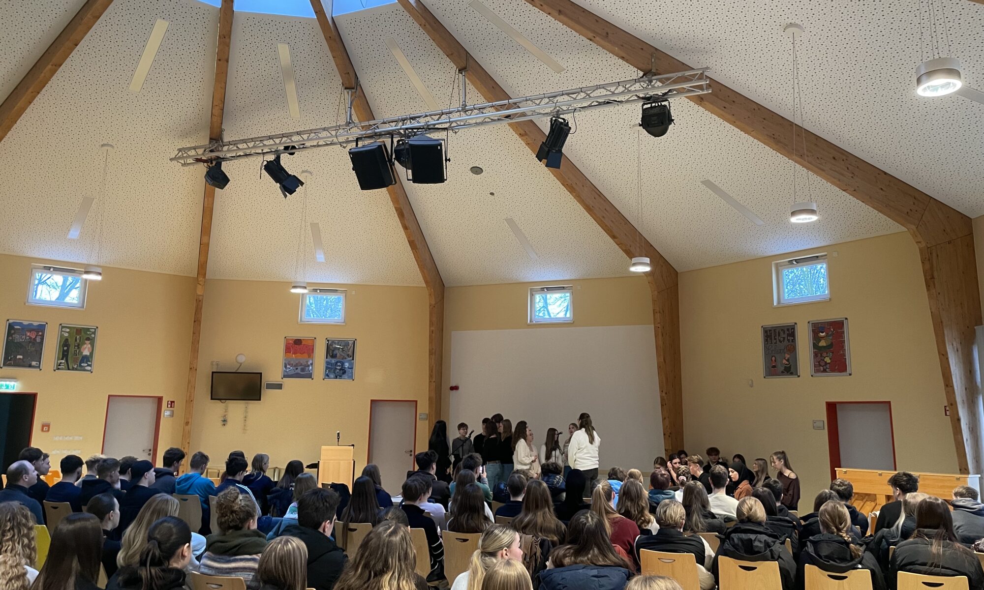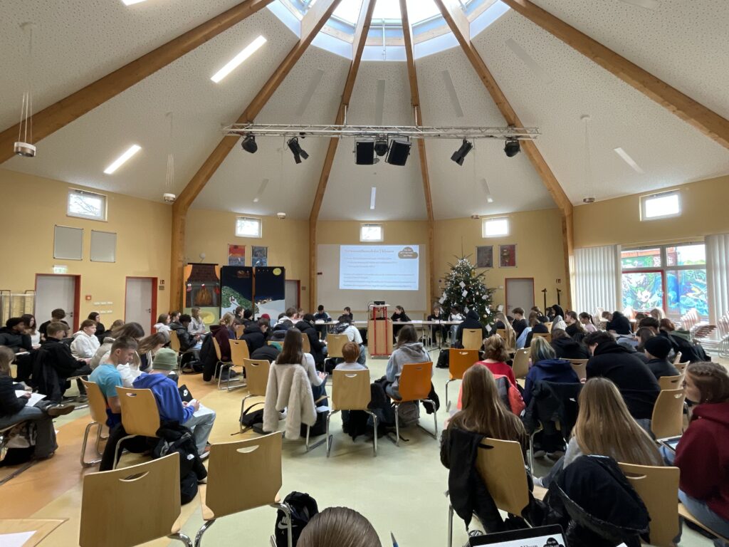 Von einem Spiel mit Homonymen im Deutsch LK bis hin zu spannenden „Blackstorys“ auf Latein im Lateinunterricht: Die ersten Stunden des Tages starteten zunächst mit dem „regulären“ Unterricht, bis es dann folglich getrennt für SEK 1 und 2 in die Cafeteria ging. Noch überwältigt von der dunklen Geschichte im Lateinunterricht mit dem Mann in der Telefonzelle und seinem Fisch neben ihm verschlug es uns also gegen 9.00 Uhr in die Cafeteria. Dort erwartete uns unser Musikkurs des 11. Jahrgangs, der zusammen mit Frau Br. einen schönen Abschluss zum Halbjahresende organisierte. So starteten sie nach Ansprache von Jakob und Pauline also mit dem Lied „No Risk No Fun“ aus dem Film Bibi und Tina und haben uns somit in unser jüngeres Ich zurückversetzt. Dann zeigten sie folglich ein im Rahmen des Musikunterrichts entstandenes Musikvideo über den Hausmeister, bei dem ein Lachen schon schwer zu unterdrücken war. Einen mit Lächeln bepackten Applaus später verzauberte uns auch Elisa (8b) wieder einmal mit ihrem Talent des Klavierspielens sowie drei Mädchen aus der siebten Klasse, die eine kleine Tanz-Choreo performten. Anschließend stellte eine weitere Schülerin des siebten Jahrgangs das Gedicht „Was uns an der Schule stört“ von Hans-Peter Kraus vor, bei dem sie trotz des vermeintlich spaßigen Inhalts aber die Ernsthaftigkeit betonte. Auch Annabelle mit ihrem Gesang sowie Isabel am Keyboard (11a) berührten wieder einmal alle mit dem Lied „Every Breath You Take“ von The Police. Bevor danach allerdings Herr von Campenhausen seine abschließenden Worte formulierte, begab sich Mia (10a), unsere Kreisschülerrats-Sprecherin, nach vorn und sprach nochmals die Wichtigkeit ihres Amtes sowie die Möglichkeit, Ideen in höhere Landesebenen einzubringen, an. Zum Schluss fasste Herr von Campenhausen noch einmal die Höhepunkte des Halbjahres zusammen, worunter neben der Berufe-Show zu Beginn, auch unser Tag der offenen Tür und die Zusammenarbeit mit dem Schweizer Haus zählen. Auch kündigte er Änderungen im zweiten Halbjahr an. Bevor es in die Pause ging, applaudierten wir ein letztes Mal für unsere Lehrkräfte, die auch trotz der stressigen Hausaufgaben dennoch für einen schönen und spannenden Unterricht sorgten, auch wenn vielleicht das ein oder andere Winterhoch, das dann doch ausblieb, zu Distanzunterricht führte. In der dritten Stunde erfolgten noch eine kurze Belehrung sowie eine Unterrichtsstunde im Fach des Klassenleiters, bevor es dann nun endlich unsere hoffentlich guten Zeugnisse gab.
