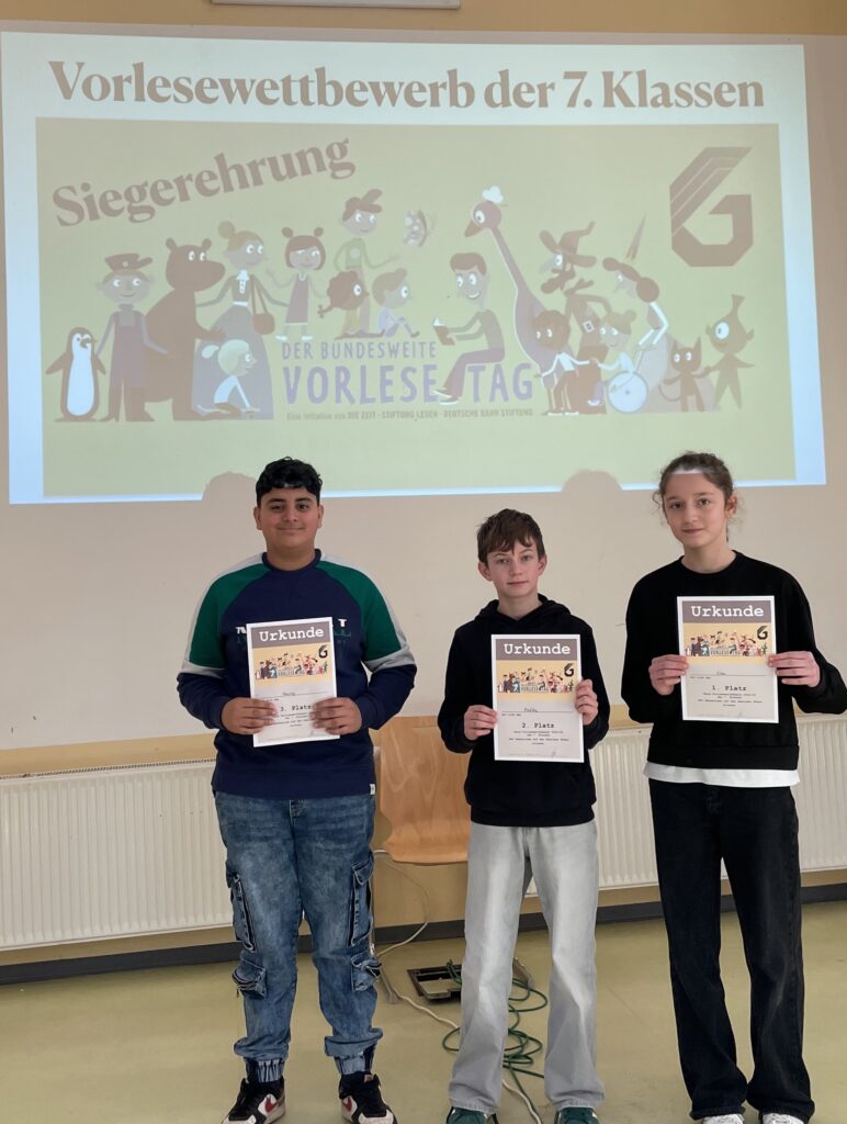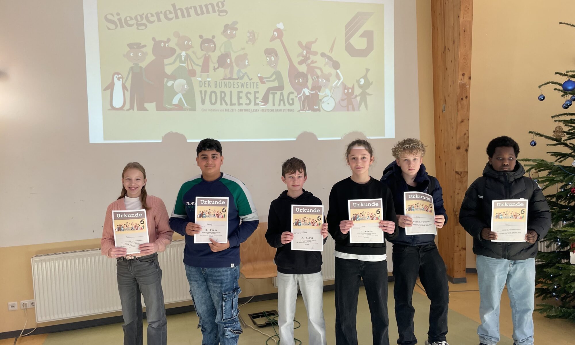 Anlässlich des jährlichen Vorlesewettbewerbs traten auch in diesem Jahr die Klassensieger unserer siebten Klassen in der Cafeteria gegeneinander an: Navraj und Meike (7a), Elza und Malthe (7b) sowie Tony und Isaq (7c). Als Unterstützung bei der Abstimmung gesellte sich auch unser Deutsch LK der 11. Klasse dazu, der ganz tatkräftig mit den anderen 7. Klassen und einer kleinen Lehrer-Juri dabei entschied, wer die/der Gewinner/-in des Jahrgangs und somit Besitzer eines verdient gewonnenen Thalia-Gutscheins sein durfte. Für unseren LK gestaltete sich dies als sehr schön, denn wir nahmen die Position ein, die, als wir uns in der 7. Klasse befanden, die damalige 9c belegte.