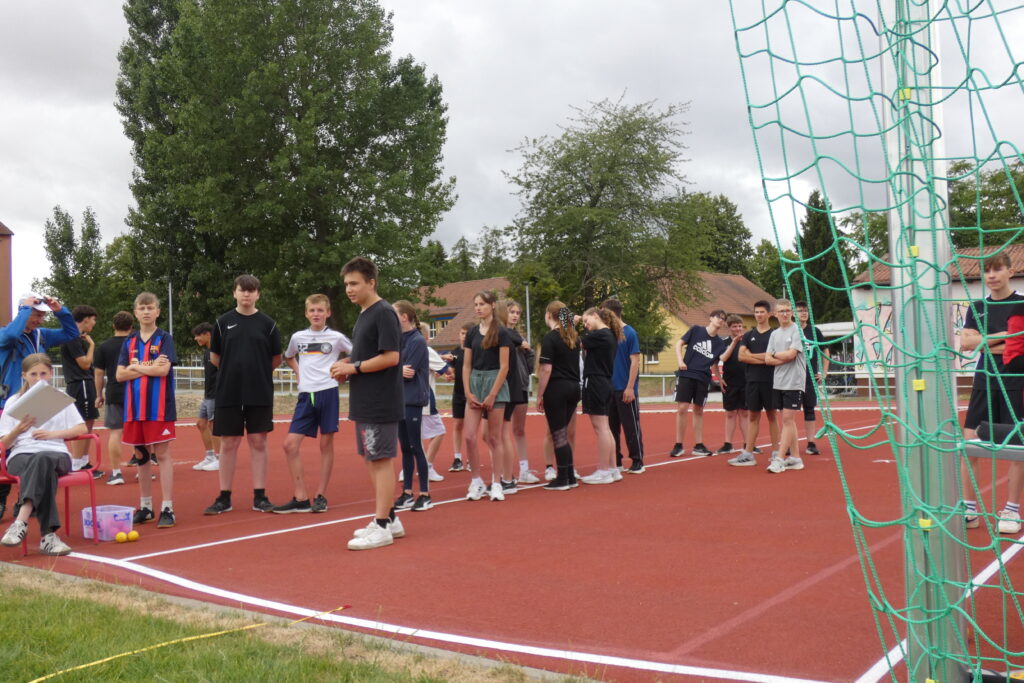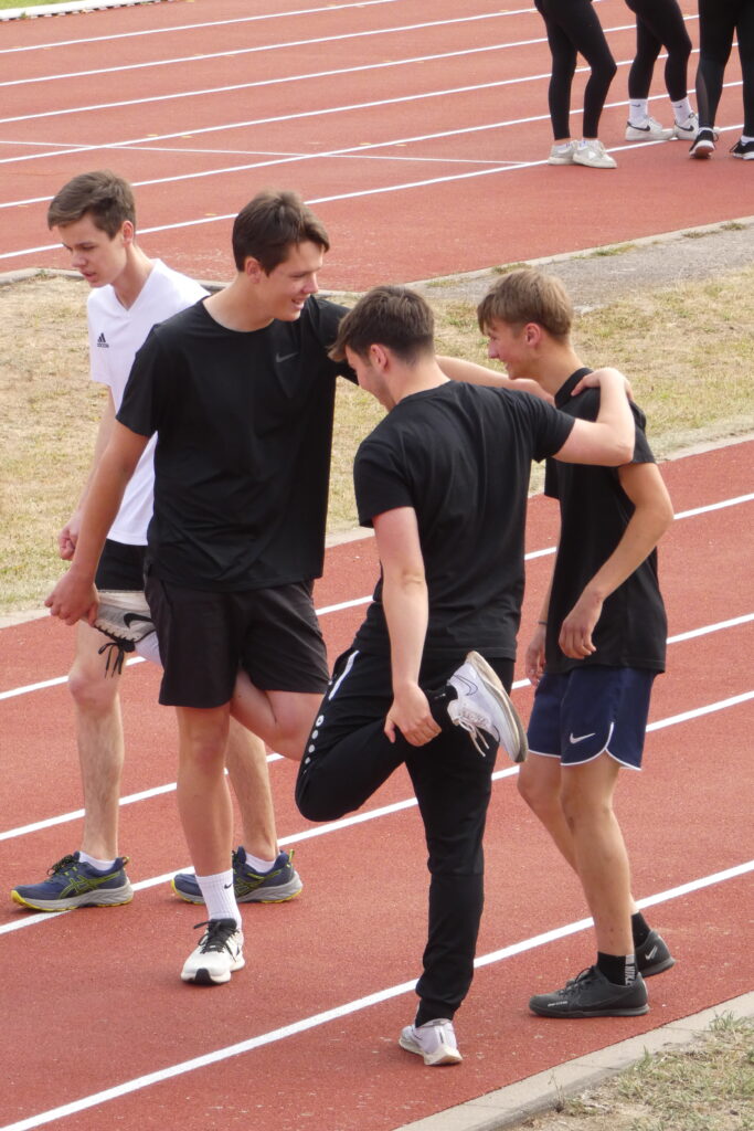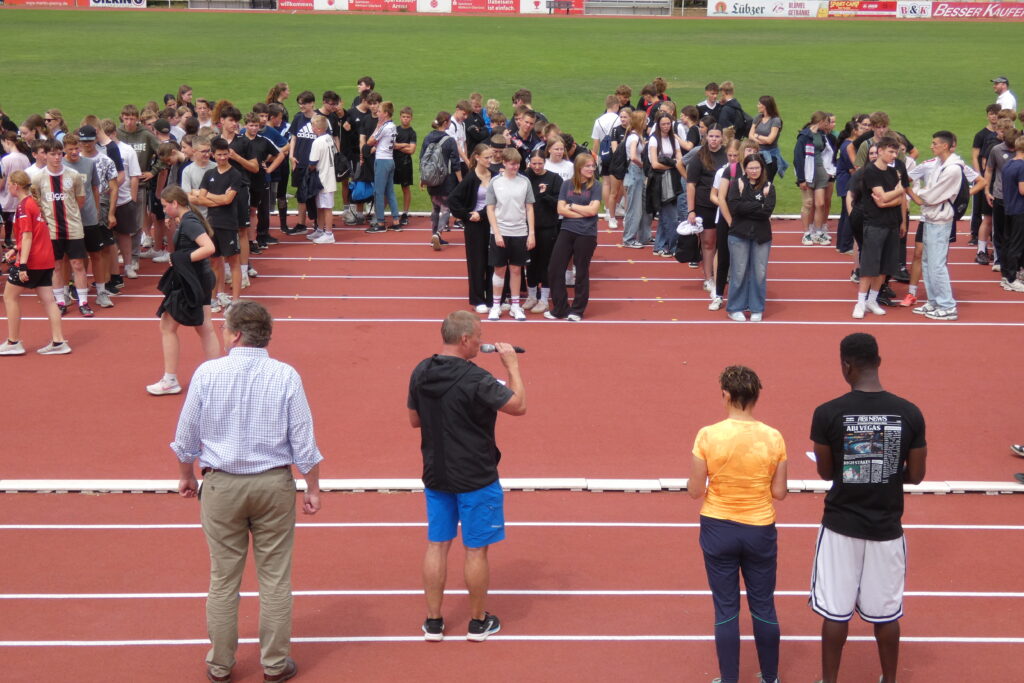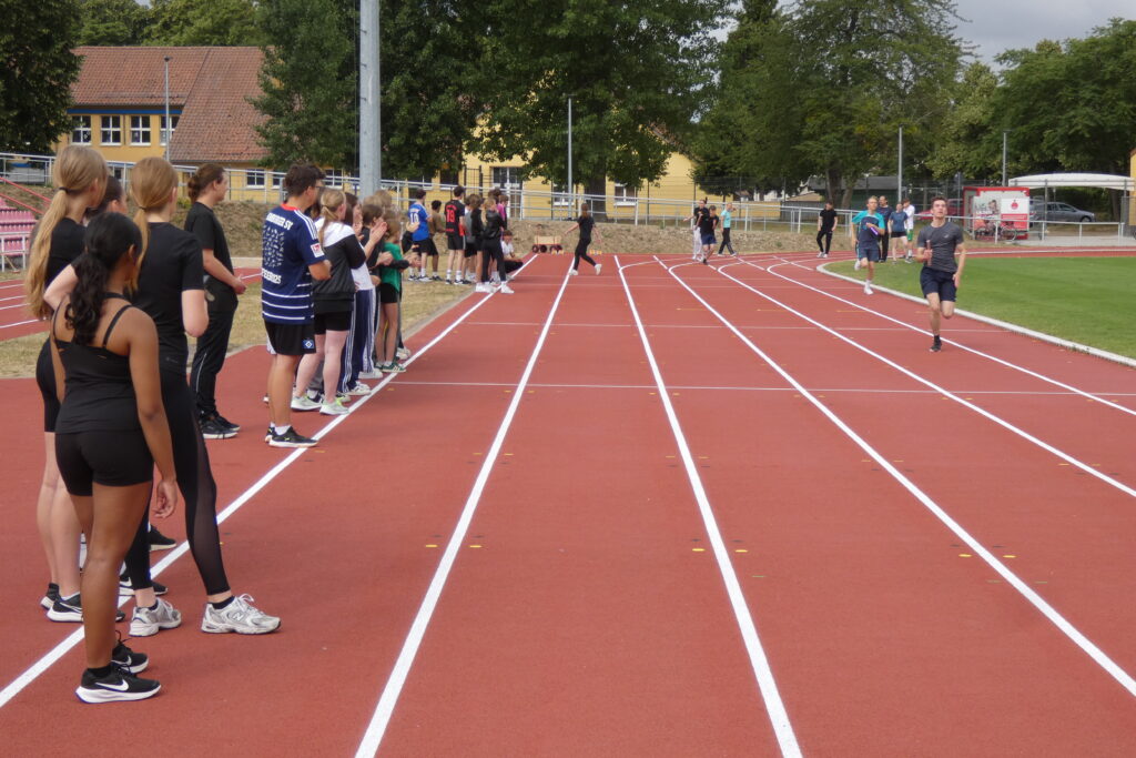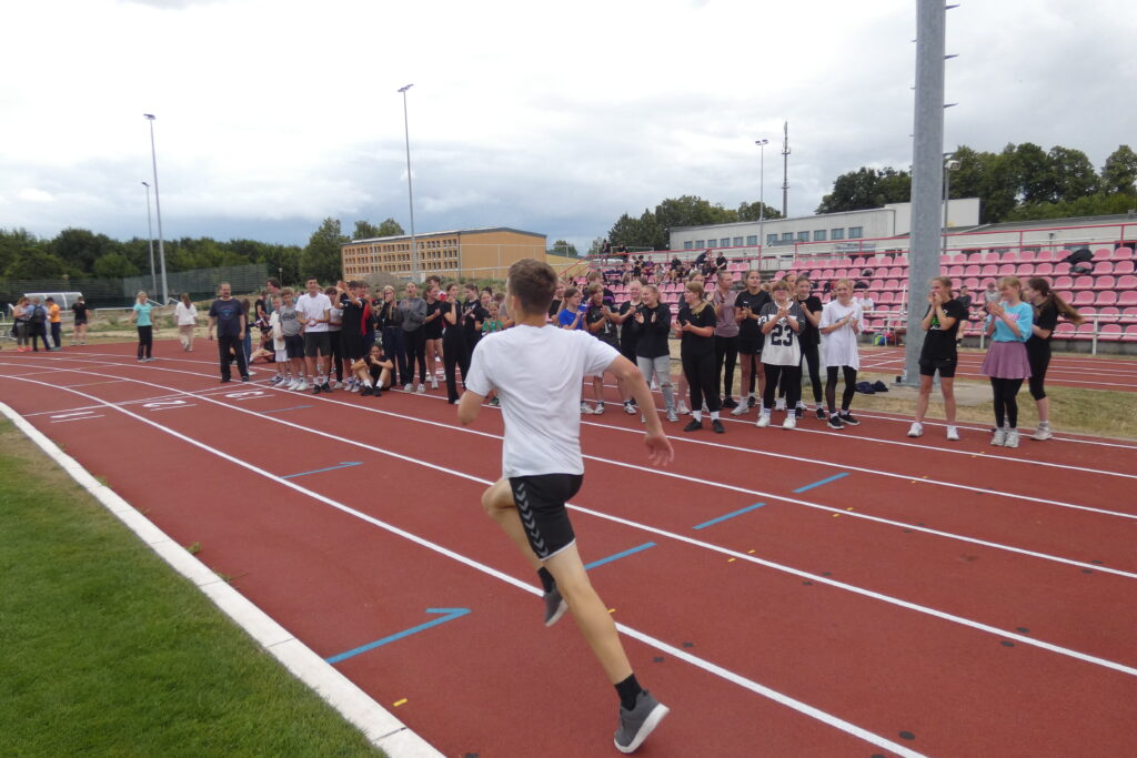 Zwischen 7.40 Uhr und 7.50 Uhr trafen sich alle Schüler/-innen sowie Lehrer/-innen im Stadion und nachdem sich Herr Bn. mit dem Mikrofon und deren Lautstärke anfreunden konnte, stellten sich alle Klassen klassenweise nebeneinander auf die Laufbahn und das diesjährige Sportfest wurde sehr zur Vorfreude aller eröffnet. Zunächst starteten alle klassenweise mit einer Aufwärmrunde, wonach anschließend die Staffelläufe der einzelnen Jahrgangsstufen folgten. Mit viel Applaus und eventuellem sportlichen Frust beim Erreichen des letzten Platzes liefen auch schon alle Klassen zu den verschiedenen Stationen nach individuellem Plan. Es gab folgende Disziplinen: Sprint (Jg. 7 mit 50m, 100m ab Jg. 8 ), Weitsprung, Weitwurf (Jg. 7 & 8) / Kugelstoß (Jg. 9-11) sowie zum Schluss der 800-Meter-Lauf. Zwischen jeder Disziplin stand eine kurze bis etwas längere Pause an, in der sich viele eine Kleinigkeit beim dortigen Imbiss oder ein Slushi-Eis bei der 10a kauften. Die Zeit verging erstaunlicherweise wie im Flug und gegen 13.00 Uhr starteten die Jungen der Jahrgangsstufe 11 auch bereits mit dem 800-Meter-Lauf, wonach dann die Mädchen folgten. Mit dieser Trennung folgten folglich ebenso die anderen Klassen, bis wir zum Schluss die Mädchen der siebten Klasse sahen. Jeder spornte jeden an, was teilweise auch ohne die Aufforderung von Herrn Bn. geschah, dessen Mikrofon an manchen Stellen unsere Motivation und Freude widerspiegelte, da es sich ab und zu eigenständig machte. Auch wenn gelegentlich Regenwolken aufzogen und bei den nicht ganz so warmen Temperaturen für eine kleine Erfrischung sorgten, endete gegen 13.30 Uhr das Sportfest, nachdem wir uns erneut versammelten und allen Sieger/-innen ihren verdienten Applaus gaben.