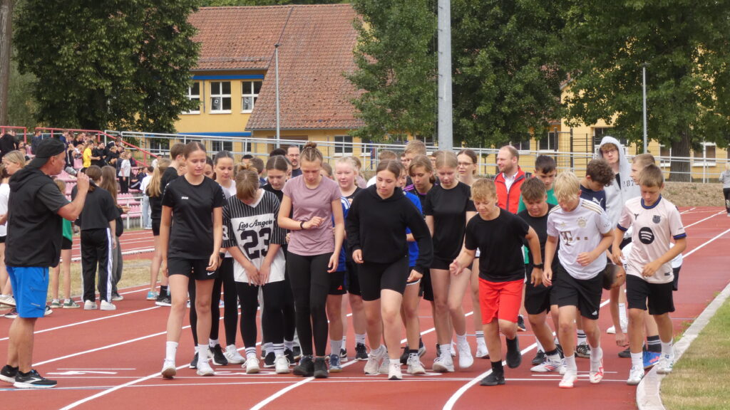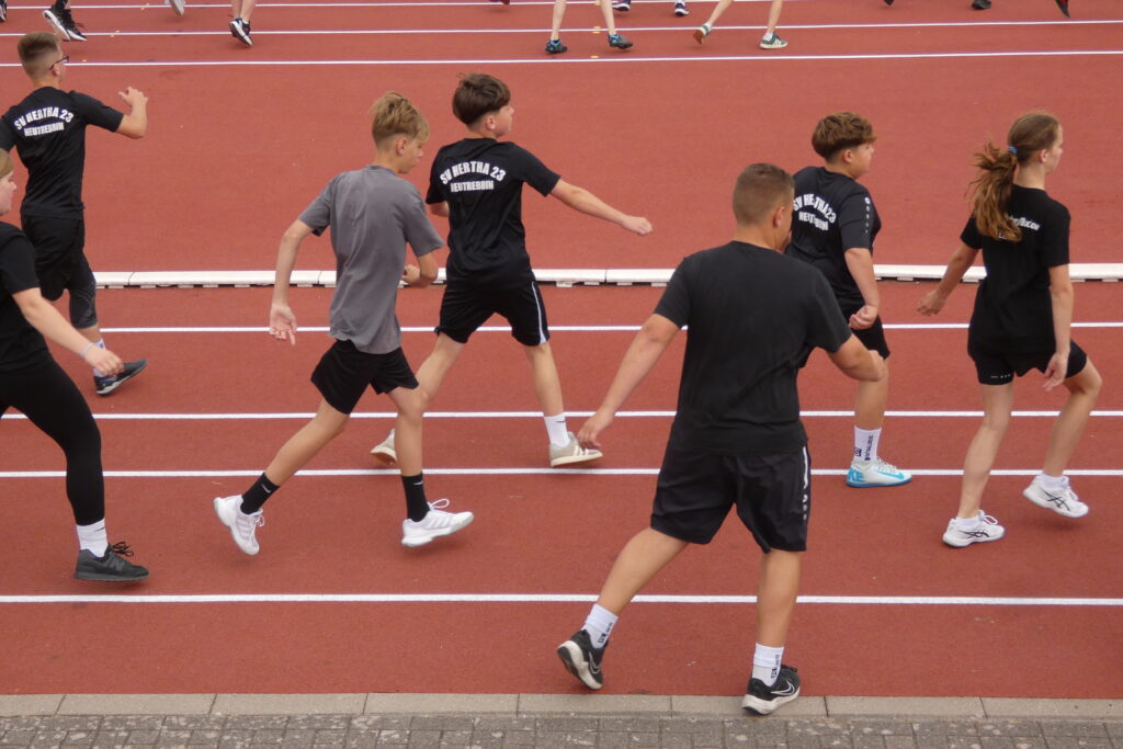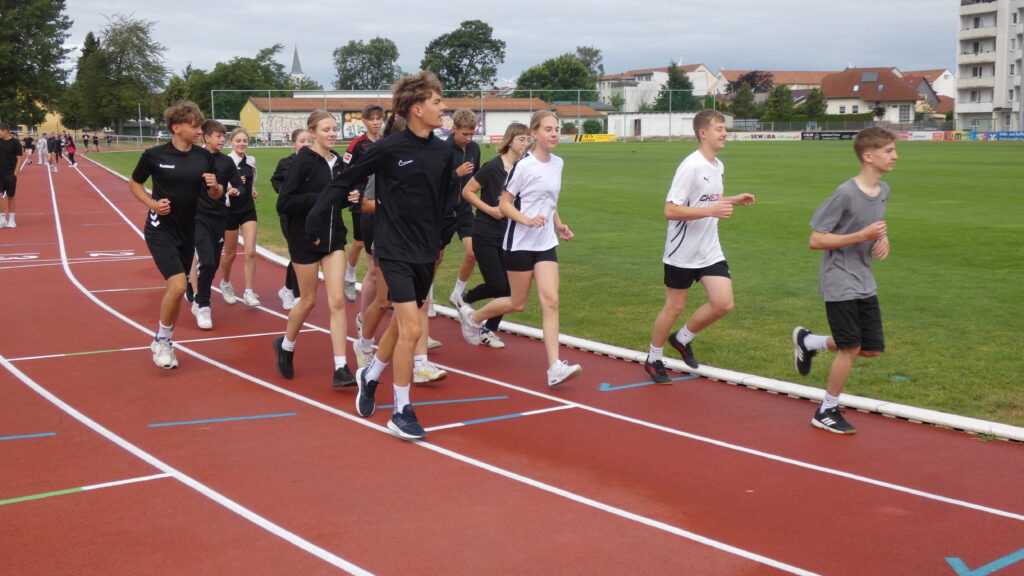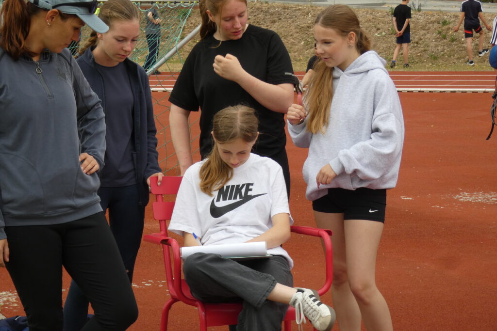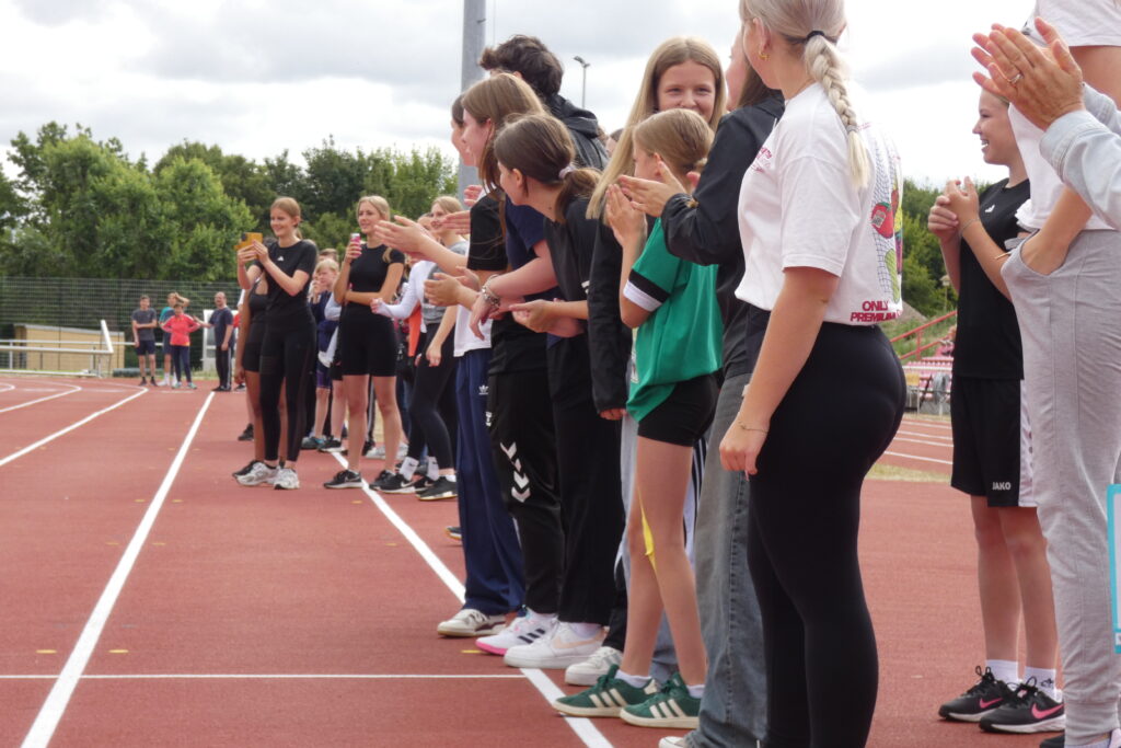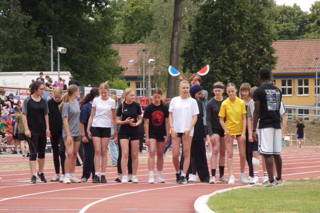 Zwischen 7.40 Uhr und 7.50 Uhr trafen sich alle Schüler/-innen sowie Lehrer/-innen im Stadion und nachdem sich Herr Bn. mit dem Mikrofon und deren Lautstärke anfreunden konnte, stellten sich alle Klassen klassenweise nebeneinander auf die Laufbahn und das diesjährige Sportfest wurde sehr zur Vorfreude aller eröffnet. Zunächst starteten alle klassenweise mit einer Aufwärmrunde, wonach anschließend die Staffelläufe der einzelnen Jahrgangsstufen folgten. Mit viel Applaus und eventuellem sportlichen Frust beim Erreichen des letzten Platzes liefen auch schon alle Klassen zu den verschiedenen Stationen nach individuellem Plan. Es gab folgende Disziplinen: Sprint (Jg. 7 mit 50m, 100m ab Jg. 8 ), Weitsprung, Weitwurf (Jg. 7 & 8) / Kugelstoß (Jg. 9-11) sowie zum Schluss der 800-Meter-Lauf. Zwischen jeder Disziplin stand eine kurze bis etwas längere Pause an, in der sich viele eine Kleinigkeit beim dortigen Imbiss oder ein Slushi-Eis bei der 10a kauften. Die Zeit verging erstaunlicherweise wie im Flug und gegen 13.00 Uhr starteten die Jungen der Jahrgangsstufe 11 auch bereits mit dem 800-Meter-Lauf, wonach dann die Mädchen folgten. Mit dieser Trennung folgten folglich ebenso die anderen Klassen, bis wir zum Schluss die Mädchen der siebten Klasse sahen. Jeder spornte jeden an, was teilweise auch ohne die Aufforderung von Herrn Bn. geschah, dessen Mikrofon an manchen Stellen unsere Motivation und Freude widerspiegelte, da es sich ab und zu eigenständig machte. Auch wenn gelegentlich Regenwolken aufzogen und bei den nicht ganz so warmen Temperaturen für eine kleine Erfrischung sorgten, endete gegen 13.30 Uhr das Sportfest, nachdem wir uns erneut versammelten und allen Sieger/-innen ihren verdienten Applaus gaben.