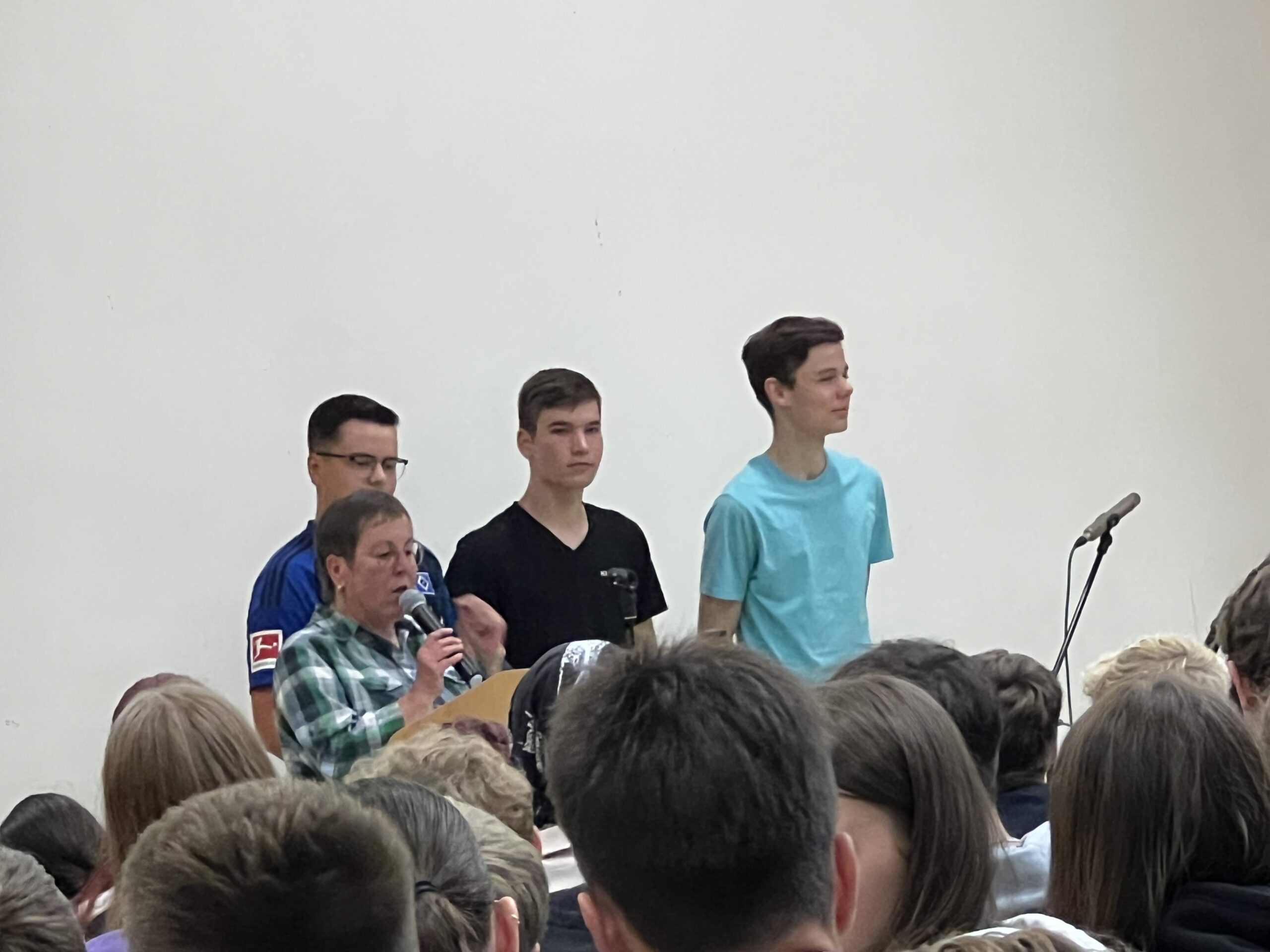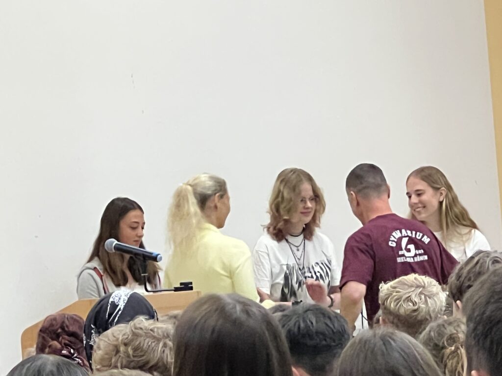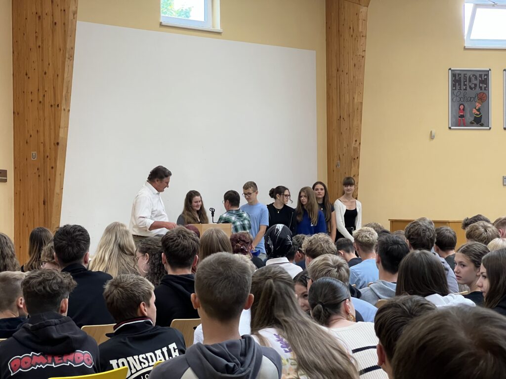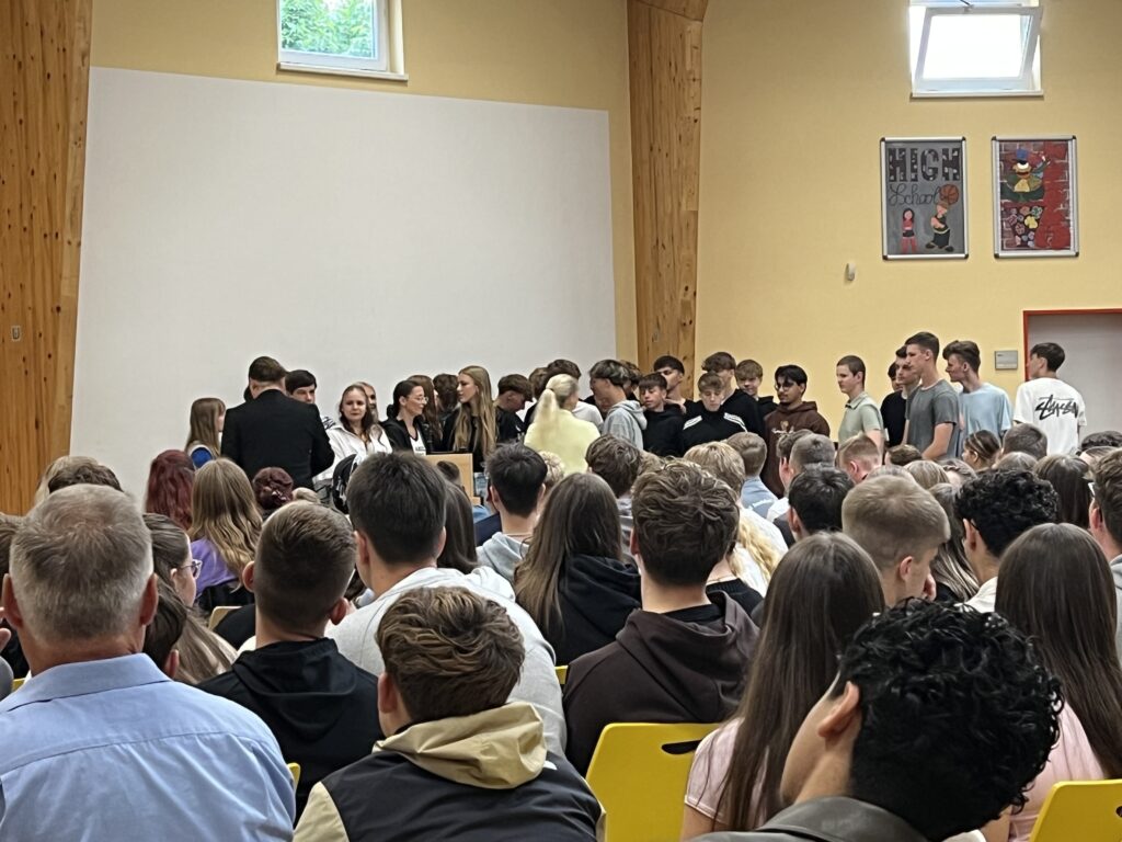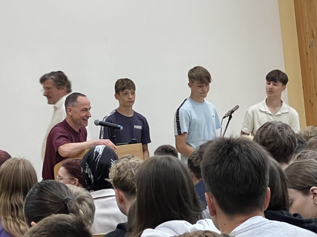 Zunächst trafen sich am Morgen alle Klassen zur gewohnten Belehrung und betraten dann zu 8.15 Uhr die Cafeteria. Nach einer kleinen musikalischen Einstimmung durch Elisa aus der 7b eröffnete Herr Cp. das gemeinsame Zusammenkommen. Zunächst wurde Frau Mr. nach vorn gebeten, die mit einigen Worten erneut von uns, ihrer Klasse, verabschiedet wurde, da wir uns bei ihr bereits gestern bei unserer Abschlussfeier sehr herzlich mit einem Geschenk bedankten. Auch Herr Dl., der von der 10b sowie 10c, und die Küchenfrau, die vom 11. Jahrgang einen kräftigen Dank erhielten, wurde mit einem Blumenstrauß traurigerweise in den verdienten Ruhestand entlassen. Anschließend folgten die Ehrungen der Jahrgangsbesten, der Gewinner/-innen des Geographie- und Känguruwettbewerbs, der Bioolympiade sowie des Spielesportfests. Somit endete zur ersten Pause die Versammlung und die Jahrgänge 7-9 sowie 11 erhielten ihre hoffentlich guten Zeugnisse, mit denen sie in die verdienten Ferien starten dürfen.