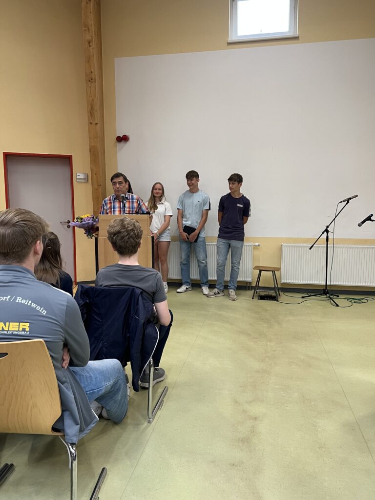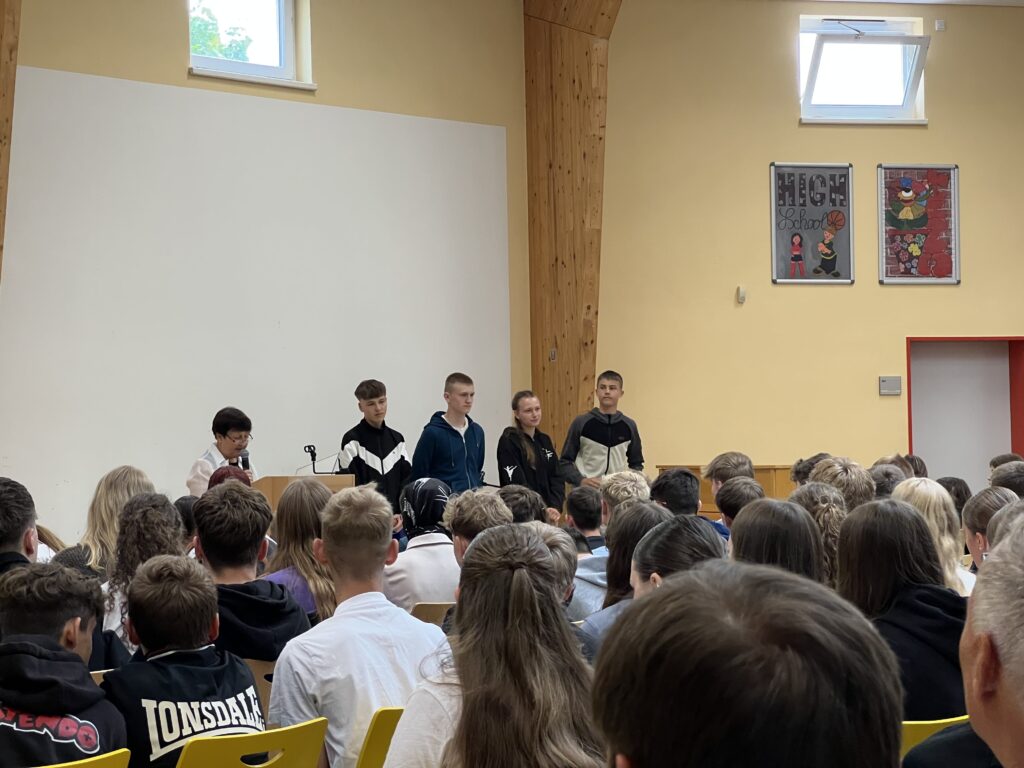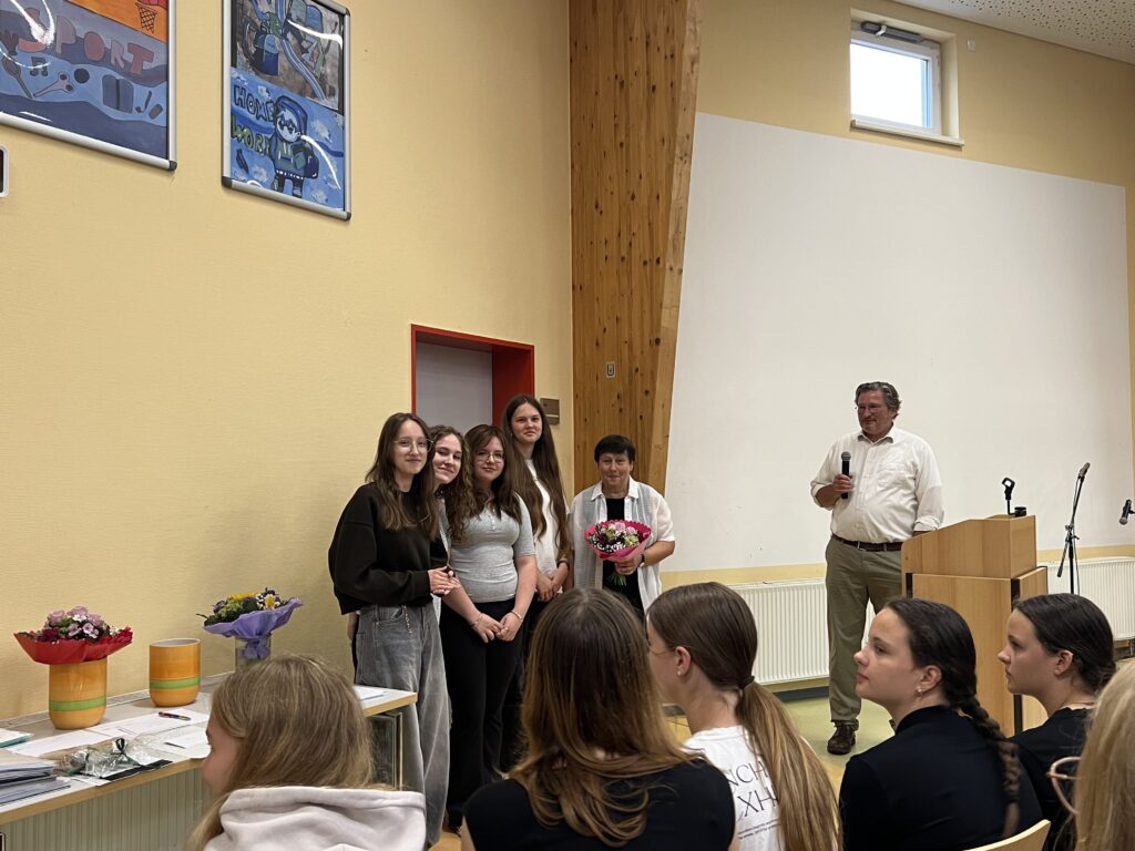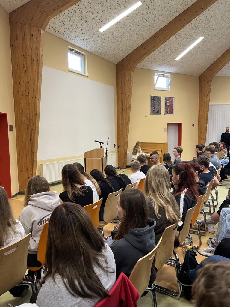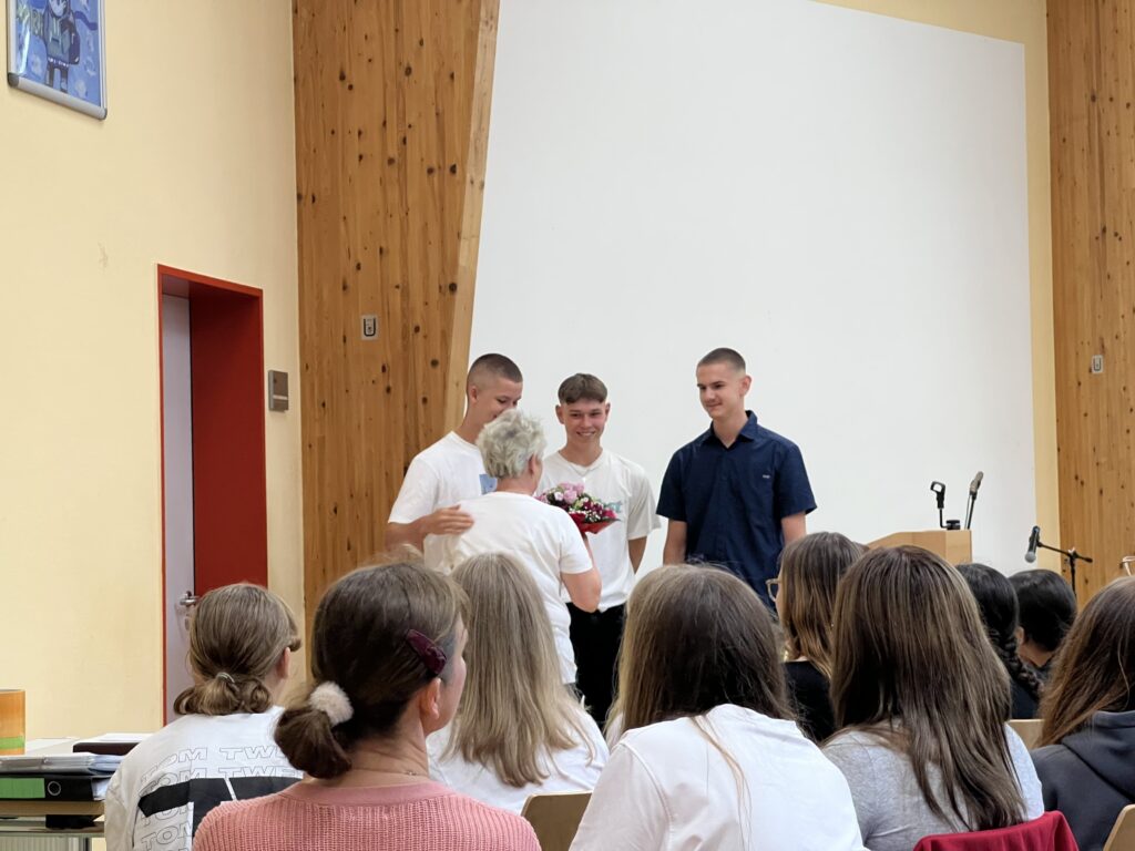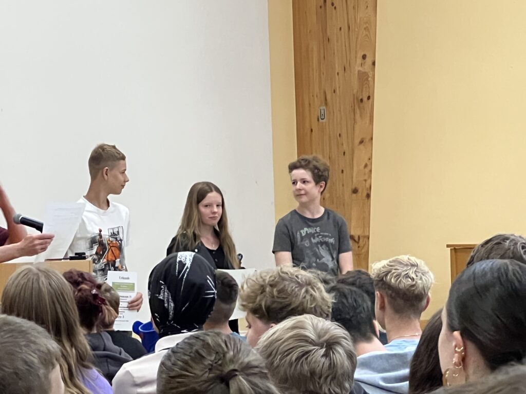 Zunächst trafen sich am Morgen alle Klassen zur gewohnten Belehrung und betraten dann zu 8.15 Uhr die Cafeteria. Nach einer kleinen musikalischen Einstimmung durch Elisa aus der 7b eröffnete Herr Cp. das gemeinsame Zusammenkommen. Zunächst wurde Frau Mr. nach vorn gebeten, die mit einigen Worten erneut von uns, ihrer Klasse, verabschiedet wurde, da wir uns bei ihr bereits gestern bei unserer Abschlussfeier sehr herzlich mit einem Geschenk bedankten. Auch Herr Dl., der von der 10b sowie 10c, und die Küchenfrau, die vom 11. Jahrgang einen kräftigen Dank erhielten, wurde mit einem Blumenstrauß traurigerweise in den verdienten Ruhestand entlassen. Anschließend folgten die Ehrungen der Jahrgangsbesten, der Gewinner/-innen des Geographie- und Känguruwettbewerbs, der Bioolympiade sowie des Spielesportfests. Somit endete zur ersten Pause die Versammlung und die Jahrgänge 7-9 sowie 11 erhielten ihre hoffentlich guten Zeugnisse, mit denen sie in die verdienten Ferien starten dürfen.